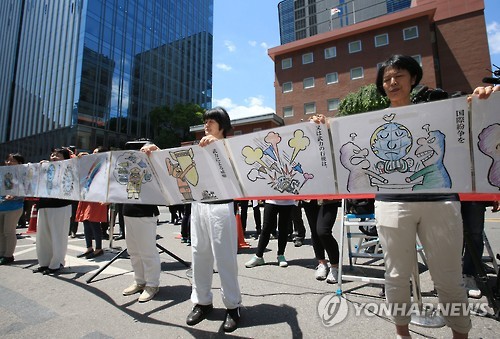 △ 일본단체, 주한 일본대사관 앞 평화헌법 9조 낭독 (서울=연합뉴스) 홍해인 기자 = 한국정신대문제대책협의회 주최로 20일 오후 서울 중학동 일본대사관 앞에서 열린 1179차 일본군 '위안부' 문제해결을 위한 정기 수요시위에서 일본 '헌법 9조-세계로 미래로 연락회' 회원들이 평화헌법 9조를 형상화한 그림을 들고 헌법 내용을 낭독하고 있다. 2015.5.20 hihong@yna.co.kr