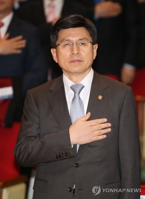 △ 새 국무총리에 내정된 황교안 법무부장관 (서울=연합뉴스) 새 국무총리에 내정된 황교안 법무부장관. 새 총리 후보 지명은 지난달 27일 이완구 전 총리 사퇴 이후 25일 만이다. 황교안 국무총리 내정자가 지난 4월 21일 오후 정부과천청사에서 열린 신임검사 임관식에서 국기에 대한 경례를 하고 있다. (연합뉴스 자료사진)