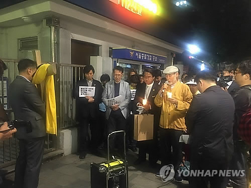 | △ (서울=연합뉴스) 설승은 기자 = 참여연대와 다산인권센터, 인권운동사랑방 등 13개 단체는 21일 오후 9시 20분께 서울 종로서 앞에서 기자회견을 열어 "집회에 참여했다는 이유로 사법처리하는 것은 부당한 탄압"이라며 "잘못된 벌금 납부를 거부하고 항의 노역을 할 것"이라고 밝혔다. 2015. 5. 21 ses@yna.co.kr |