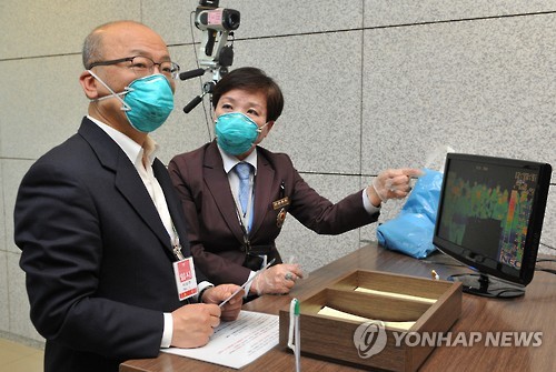 | △ 메르스 검역 상황 점검하는 문형표 장관 문형표 보건복지부 장관이 23일 메르스 확산 방지를 위해 인천공항으로 입국한 카타르 도하발 항공기의 특별 검역 상황을 점검하며 열감지 영상에 대한 설명을 듣고 있다. 2015.5.23 <<보건복지부 제공>> |