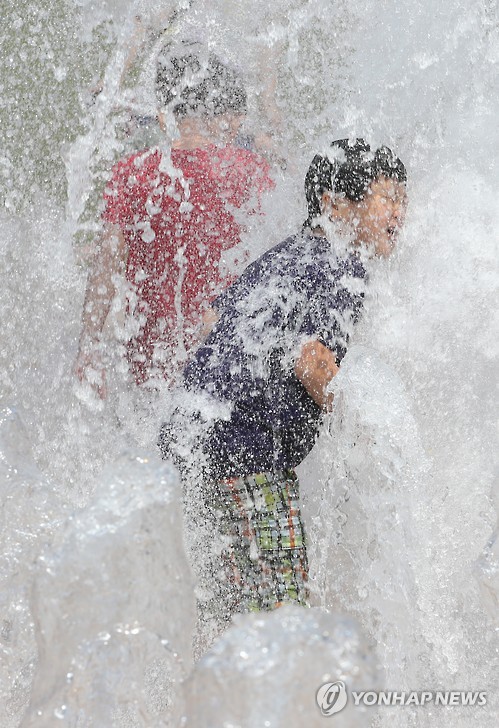 | △ 때이른 더위에 분수대로 뛰어든 아이들 (서울=연합뉴스) 임헌정 기자 = 대구와 경남·경북 일부 지방에 올해 들어 처음으로 폭염주의보가 내려지는 등 전국적으로 30도를 웃도는 무더운 날씨를 보인 25일 오후 서울 중구 서울시청 앞 광장 분수대에 뛰어든 어린이들이 더위를 식히고 있다. 2015.5.25 kane@yna.co.kr |