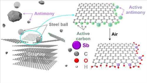 연구팀은 이점에 주목해 기계화학적 공정인 '볼밀링'을 통해 그래핀 가장자리에 금속과 비금속의 중간 성질인 '안티몬'이라는 준금속을 입히는 데 성공했고, 새롭게 탄생한 그래핀이 산소환원용 촉매로서 우수한 특성을 가진 것을 확인했다.