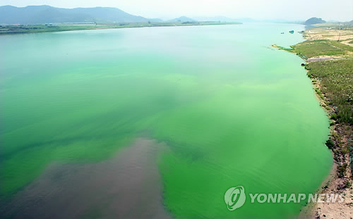 | △ 초록물감 풀어 놓은 듯..낙동강 녹조 현상 (창원=연합뉴스) 최병길 기자 = 낙동강 본류에서 하루 28만t의 물을 취수하는 경남 창원시 본포취수장 인근 강이 4일 초록빛 물감을 풀어 놓은 듯 녹조현상이 심하다.환경단체에서는 이 녹조가 4대강 사업으로 보가 건설되면서 낙동강이 거대한 호수로 변했기 때문이라고 주장하고 수자원공사측은 이상 고온과 가뭄 영향으로 나타난 일시적 현상이라고 주장했다.2012.7.4 choi21@yna.co.kr |
