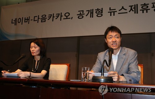 | △ (서울=연합뉴스) 서명곤 기자 = 28일 오전 서울 중구 태평로 한국프레스센터에서 열린 '네이버-다음카카오, 공개형 뉴스제휴평가위원회 설명회'에서 임선영 다음카카오 이사(왼쪽)와 유봉석 네이버 이사가 취재진의 질문에 답하고 있다. 언론계 중심으로 구성되는 뉴스제휴평가위원회가 심사를 거쳐 매체의 자격을 평가하면 양사가 이를 바탕으로 뉴스 제휴를 맺거나 연장하는 내용이 골자다. 2015.5.28 seephoto@yna.co.kr |