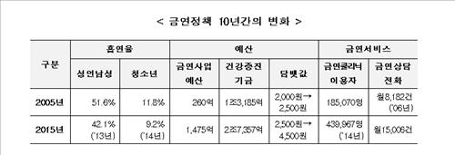 아울러 금연사업 예산은 2005년 260억원에서 2015년 1천475억원으로 5배 이상 늘었고 금연 클리닉 이용자는 2005년 18만5천70명에서 2014년 43만9천967명으로 급증했다.
