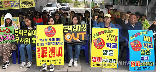 △ 용산 화상경마장도박장 추방 대책위원회 소속 주민이 9일 서울 용산구 용산 화상경마장 앞에서 학교 정화구역 부근의 화상경마장 개장 반대를 요구하며 구호를 외치고 있는 모습(연합뉴스 자료사진)