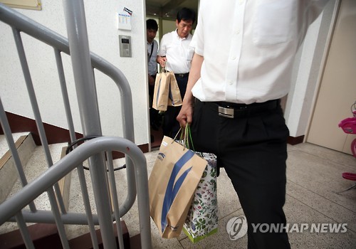 | △ 대선자금 겨냥하는 검찰 (대전=연합뉴스) 양영석 기자 = '성완종 리스트'를 수사 중인 검찰 관계자들이 29일 지난 2012년 대선 당시 새누리당 캠프에 몸담고 수석부대변인 직책을 맡았던 김모씨의 대전 자택을 압수수색, 압수품을 들고 나오고 있다. 2015.5.29 youngs@yna.co.kr |