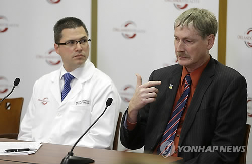 | △ 미국에서 두번째 메르스(중동호흡기증후군) 감염 사례로 보고된 남성을 치료중인, 플로리다주 올랜도의 필립스 병원에서 작년 5월 13일(현지시간) 이 병원의 앤토니오 크레스포 박사(왼쪽)와 주 보건부 케빈 셰린 박사가 기자회견하고 있다. |