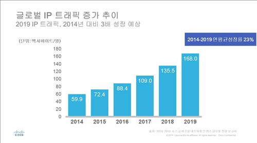 (서울=연합뉴스) 윤보람 기자 = 전 세계 IP 트래픽이 2019년에는 지금보다 3배가량 늘고 우리나라의 트래픽도 2배가량 증가할 것이라는 전망이 나왔다.