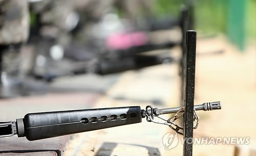 | △ 단단히 묶인 총기 (대전=연합뉴스) 양영석 기자 = 예비군 훈련장에서 발생한 총기사고로 3명이 숨진 가운데 14일 육군 32사단 예하 대전 유성구 예비군훈련소에서 정상적인 실탄훈련이 진행되고 있다. 군은 실탄을 3발씩 탄창 2개에 나눠지급하고, 총기이탈방지대와 안전고리를 단단히 묶어 총구를 돌리지 못하도록 하는 등 안전통제 규정을 강화했다. 2015.5.14 youngs@yna.co.kr |