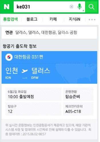 스마트폰에서 네이버 검색창에 항공기 편명을 입력하면 항공기의 출발시간, 체크인 카운터, 탑승구 위치뿐 아니라 기상악화로 인한 항공기의 지연·결항 여부도 알아볼 수 있다.