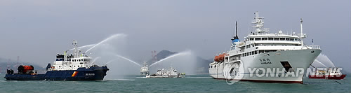 | △ 화재 여객선 진화 나선 소방정 (부산=연합뉴스) 김선호 기자 = 부산해양경비안전서는 세월호 1주년이자 제1회 국민안전의 날인 16일 부산 해경 전용부두 앞 해상에서 민관군이 합동으로 해양사고 실전 대응력을 높이는 인명구조 훈련을 벌이고 있다. 소방정이 화재가 발생한 여객선에 물을 뿌리며 접근하고 있다. 2015.4.16 wink@yna.co.kr |