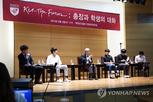 | △ 고려대 '총장과 학생의 대화' 개최 (서울=연합뉴스) 염재호 고려대 총장이 3일 오후 서울 안암동 고려대 백주년기념관에서 열린 '총장과 학생의 대화'에서 학생들과 이야기를 하고 있다. (고려대 제공) |