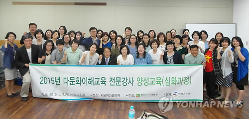 | △ 다문화이해교육 전문강사 위촉식 (서울=연합뉴스) 5일 서울 대방동 서울여성플라자에서 다문화이해교육 전문강사 위촉식이 끝난 뒤 참석자들이 기념촬영을 하고 있다. 한국건강가정진흥원은 이날 양성교육을 마친 다문화이해교육 전문강사 40명을 위촉했다. (한국건강가정진흥원 제공) |