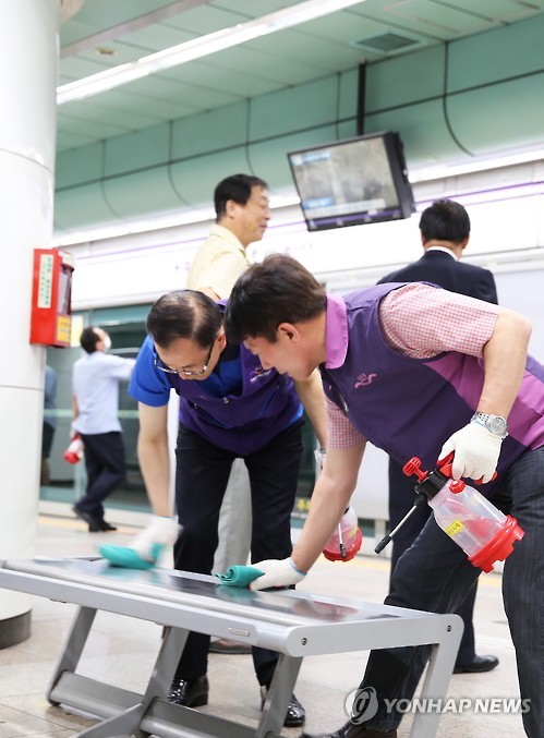 | △ 승강장 소독하는 서울도시철도공사 임직원 (서울=연합뉴스) 서울도시철도공사 임직원들이 5일 메르스 확산을 막기 위해 5호선 광화문역 승강장 의자를 소독하고 있다. (서울도시철도공사 제공) |