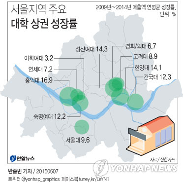 7일 신한카드가 서울지역 10개 주요 대학 상권의 2009년∼2014년 매출액 연평균 성장률 관련 빅데이터를 분석한 결과에 따르면 홍익대가 16.9%로 가장 높았고 그다음이 성신여대(14.3%)와 한양대(14.1%) 순이었다.