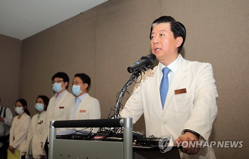 | △ 메르스 관련 공식 입장 밝히는 삼성서울병원장 (서울=연합뉴스) 이정훈 기자 = 송재훈 삼성서울병원장이 7일 오전 서울 일원동 삼성서울병원 중강당에서 기자회견을 열고 메르스 감염의 현황과 조치 등 병원의 공식 입장을 밝히고 있다. |
