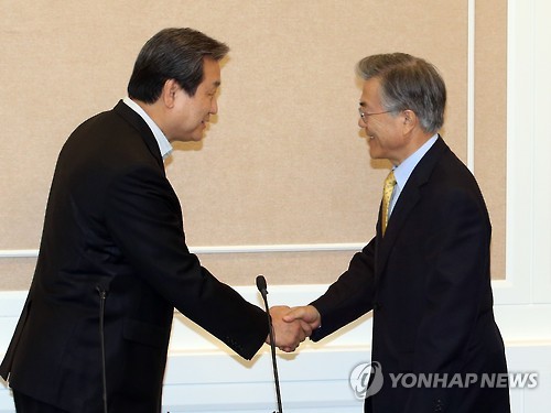 | △ '메르스 공동대응', 여야 대표 악수 (서울=연합뉴스) 도광환 기자 = 7일 오전 국회에서 열린 메르스 대책마련을 위한 여야 4+4회담에서 새누리당 김무성 대표와 새정치민주연합 문재인 대표가 악수하고 있다. |