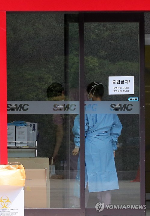 △ 감염관리 중! (서울=연합뉴스) 이정훈 기자 = 정부가 메르스 병원명단을 공개한 7일 오전 서울 일원동 삼성서울병원의 폐쇄된 응급실 출입구 앞으로 병원 관계자들이 분주하게 이동하고 있다. 2015.6.7 uwg806@yna.co.kr