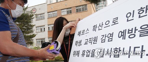 △ (화성=연합뉴스) 신영근 기자 = 경기도교육청이 중동호흡기증후군(메르스) 확산 여파로 경기도 수원과 용인, 평택, 안성, 화성, 오산, 부천 등 7개 지역 모든 유치원과 초·중·고등학교 및 특수학교에 일제 휴업 명령을 내린 가운데 8일 오전 화성의 한 초등학교에서 교직원들이 교육청의 휴업 명령 내용을 정문에 게시하고 있다. 휴업 기간은 8일부터 12일까지다. 2015.6.8 drops@yna.co.kr http://blog.yonhapnews.co.kr/geenang