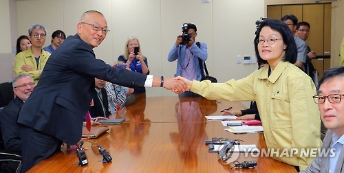 △ 악수하는 후쿠다 게이지 WHO 사무차장과 장옥주 보건복지차관 (세종=연합뉴스) 배재만 기자 = 메르스 합동 조사를 위해 입국한 후쿠다 게이지 WHO 사무차장이 9일 오전 정부세종청사 보건복지부를 방문, 장옥주 보건복지부 차관과 악수하고 있다.