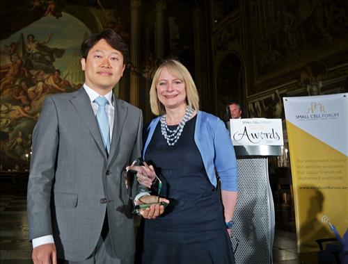 | △ 10일(현지시간) 런던에서 열린 '스몰 셀 인더스트리 어워드'에서 SK텔레콤의 김창영 매니저(사진 왼쪽)가 시상자인 리싱크 테크놀로지 리서치사의 캐롤라인 가브리엘 디렉터로부터 최우수 상용화(도심지역) 부문상을 받는 모습. <SK텔레콤 제공> |