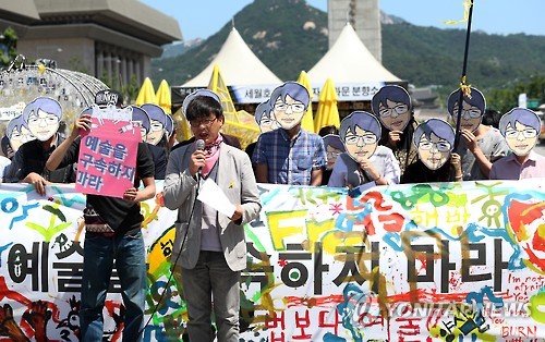 | △ 지난 3일 '박근혜 정부와 사법권력의 예술탄압을 규탄하는 기자회견'에서 시낭송하는 송경동 시인(연합뉴스 자료사진) |