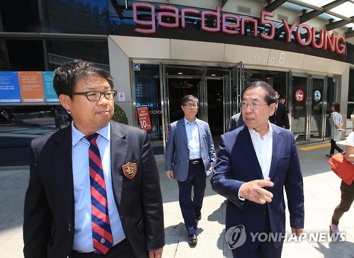 | △ 가든파이브 찾은 박원순 시장 (서울=연합뉴스) 홍해인 기자 = 박원순 서울시장이 12일 서울 문정동 대형쇼핑몰 가든파이브를 찾아 관계자로부터 상인들의 영업 상황에 대한 설명을 듣고 있다. 이 쇼핑몰은 중동호흡기증후군(메르스) 35번째 환자인 삼성서울병원 의사 A씨가 의심 환자 상태였던 지난달 30일 다녀간 곳이다. |