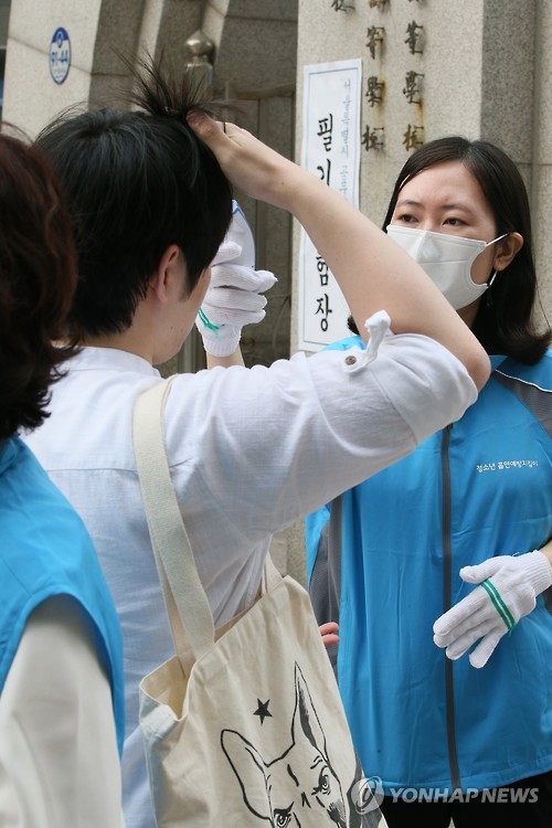 | △ '예외 없는 발열검사' (서울=연합뉴스) 박지호 기자 = 2015년도 서울시공무원 임용시험일인 13일 오전 서울 강서구의 한 시험장 앞에서 수험생들이 중동호흡기증후군(메르스) 예방을 위한 발열검사를 받고 있다. 2015.6.13 jihopark@yna.co.kr |