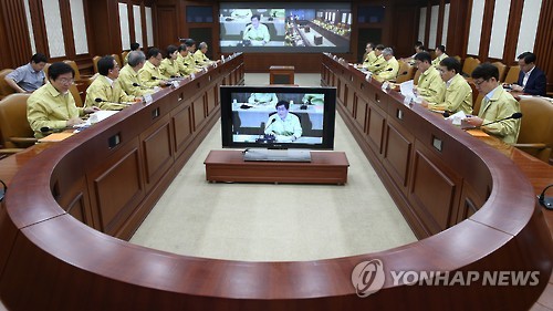 △ 메르스 대책회의 된 경제관계장관회의 (서울=연합뉴스) 황광모 기자 = 지난 10일 오전 서울 세종로 정부서울청사에서 열린 경제관계장관회의에 참석한 관계 부처 장·차관들이 화상을 통해 중계되는 최경환 경제부총리 겸 기획재정부 장관의 중동호흡기증후군(메르스) 종식에 관한 발언을 듣고 있다. 이날 회의는 서울과 세종 청사간 화상으로 진행됐다. 2015.6.10 hkmpooh@yna.co.kr
