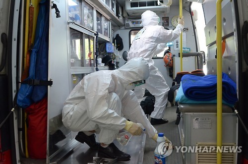 △ 구급차 소독하는 소방대원들 (서울=연합뉴스) 중동호흡기증후군(메르스) 감염 방지 교육을 받은 소방대원들이 2일 서울 영등포소방서에서 구급차 소독을 하고 있다. 2015.6.2 << 영등포소방서 제공 >> photo@yna.co.kr