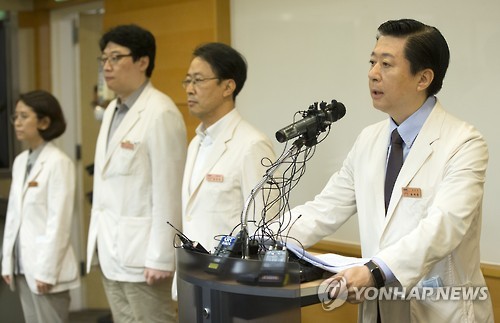 △ 발언하는 송재훈 병원장 (서울=연합뉴스) 윤동진 기자 = 14일 오전 서울 강남구 서울삼성병원 암병원에서 열린 기자회견에서 송재훈 삼성서울병원 병원장이 중동호흡기증후군(메르스)과 관련된 병원 방침을 말하고 있다. 송 원장은 이날 기자회견에서 "이날부터 신규 외래·입원 환자를 한시적으로 제한하며 응급수술을 제외하고는 수술과 응급진료도 한시 중단한다"고 밝혔다. 2015.6.14 mon@yna.co.kr