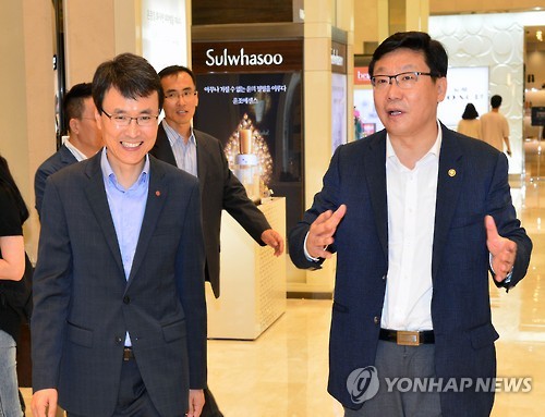 | △ 주형환 기재부 차관 메르스 관련 현장방문 (서울=연합뉴스) 주형환 기획재정부 차관이 14일 메르스와 관련해 서울 중구 신세계 백화점을 방문해 관계자들과 대화하고 있다. 2015.6.14 << 기재부 제공 >> jjaeck9@yna.co.kr |