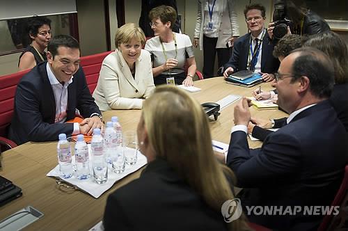 | △ 그리스·독일·프랑스 채무협상 3자회동 (브뤼셀 AP=연합뉴스) 알렉시스 치프라스 그리스 총리(왼쪽부터)와 앙겔라 메르켈 독일 총리, 프랑수아 올랑드 프랑스 대통령(오른쪽)이 10일(현지시간) 벨기에 브뤼셀에서 열린 유럽연합(EU)-라틴아메리카·카리브 국가공동체(CELAC) 정상회의에서 그리스 구제금융 관련 논의를 하고 있다. 그리스 정부는 회동에 앞서 채무협상 타결의 관건인 기초예산 흑자 목표치를 놓고 양보안을 논의할 뜻을 시사했다. |