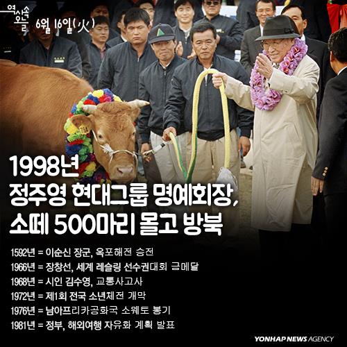 (서울=연합뉴스) 1998년 6월 16일 오전 9시6분께. 황소 8마리를 실은 1호 트럭이 잠시 판문점 군사분계선에 멈춰 섰다가 북측으로 넘어갔다. 소 500마리를 실은 트럭 50대가 군사분계선을 모두 넘은 것은 오전 9시21분께. 이어 오전 10시 정각에 정주영(1915∼2001) 현대그룹 명예회장이 걸어서 군사분계선을 넘었다. 분단 이후 처음으로 민간인이 판문점을 통과해 북한 땅을 밟는 역사적인 순간이었다.