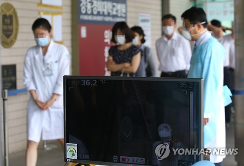 | △ 메르스 자가격리 불응자가 경찰에 고발됐다. 사진은 서울 강동경희대병원에서 병원 관계자 및 시민들이 병원 입구에서 열감지기 앞을 통과하고 있다. |