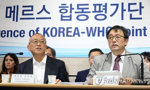 | △ (세종=연합뉴스) 배재만 기자 = 한국과 세계보건기구(WHO) 합동평가단 공동단장인 케이지 후쿠다 WHO 사무차장(왼쪽)이 13일 오전 정부세종청사 보건복지부에서 열린 기자회견에서 평가단 활동 결과를 발표하고 있다. 오른쪽은 공동단장인 이종구 서울대 의과대학 이종욱글로벌의학센터 센터장. 2015.6.13 scoop@yna.co.kr |