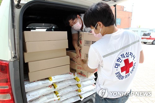 | △ '메르스 자가격리자를 위해' (서울=연합뉴스) 대한적십자사 경기도지사는 17일 경기도 내 중동호흡기증후군(MERS) 자가격리자들을 위해 구호품(쌀, 라면, 부식세트)을 해당 시·군 보건소로 전달했다고 17일 전했다. 대한적십자사 관계자들이 구호물품을 운반하고 있다. 2015.6.17 << 대한적십자사 제공 >> photo@yna.co.kr |