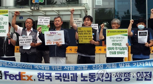(서울=연합뉴스) 임기창 기자 = 민주노총 전국공공운수노동조합은 미국 국방부의 탄저균 국내 반입 사고와 관련, 고위험물질인 탄저균의 배송을 담당한 다국적 물류업체 페덱스(FedEx)를 당국에 고발하기로 했다고 19일 밝혔다.