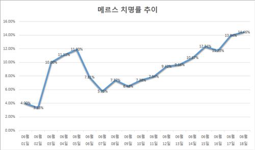 메르스 치명률 14.5%…"환자 발생 줄어 더 오를수도"