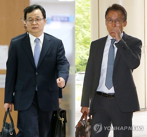 | △ 삼성물산-엘리엇 법정 공방 시작 (서울=연합뉴스) 한종찬 이승민 기자 = 19일 오전 서울 서초구 중앙지법에서 엘리엇이 삼성물산과 제일모직의 합병을 무산시키기 위해 제기한 2건의 가처분 소송에 대한 첫 심문이 열렸다. 사진은 이날 오전 법원에 출석하는 삼성물산 측 김용상 변호사(왼쪽)과 엘리엇의 법률 대리인 최영익 변호사. 2015.6.19 saba@yna.co.kr |