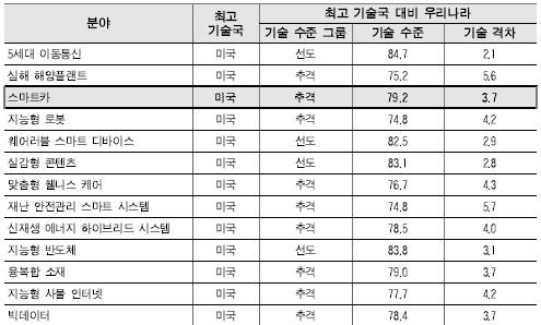 이들 분야의 핵심기술을 세계 최고 기술국으로 평가받는 미국과 비교했을 때 기술 수준은 평균 79.1%, 기술격차는 평균 3.85년 가량 뒤처진 것으로 추정됐다.