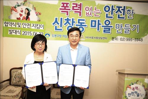 [도봉구 부자동네타임즈 이영진 기자] 서울 도봉구(구청장 이동진)는 서로사랑상담센터와 협약을 맺고 '여성폭력 없는 안전마을 사업'을 벌인다고 24일 밝혔다.