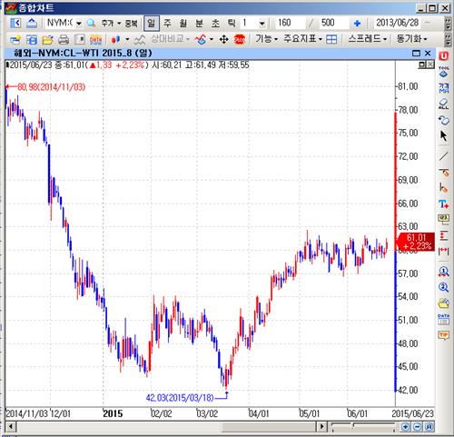 이날 뉴욕상업거래소에서 8월물 서부텍사스산원유(WTI) 가격은 전날보다 배럴당 63센트 오른 61.01달러에 마쳤다.