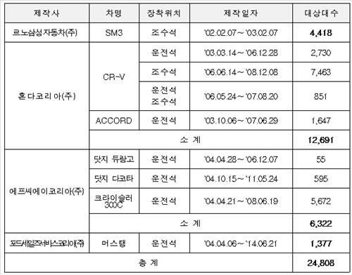국토부는 다카타 에어백을 장착한 르노삼성의 SM3 4천418대, 혼다코리아의 CR-V 1만1천44대와 어코드 1천647대, 닷지 듀랑고 55대, 닷지 다코타 595대, 크라이슬러300C 5천672대, 머스탱 1천377대를 리콜한다고 밝혔다.