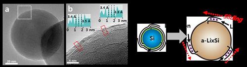 물리적 강도와 전도도가 높은 그래핀을 세계 최초로 실리콘 표면에 성장시켜 충방전 중 부피 팽창으로 인한 구조 붕괴를 막는 그래핀층 구조의 소재를 합성했다.