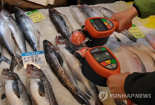 △ 휴대용 방사능 측정기를 이용해 일본산 수산물에 대한 방사능 오염 여부를 검사하고 있다. (연합뉴스 자료사진)