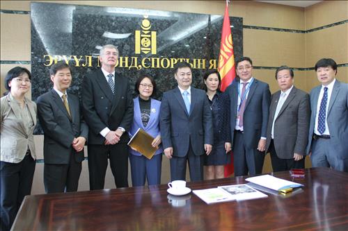 | △ 왼쪽에서 2번째 (사)생명잇기 이사장(계명대학교 동산의료원 조원현 교수), 3번째 세계이식학회 이사장(Philip O'Connell), 4번째 안규리 교수, 5번째 몽골 복지부 차관(D.Atarmaa), 7번째 몽골제1병원장(B.Byambadorj), 8번째 몽골 이식학회 회장(D.Nyamsuren), 9번째 몽골 이식학회 이사장(P.Batchuluun). |