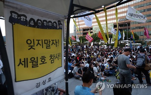 △ 세월호특별법 시행령 개정 촉구 집회 (서울=연합뉴스) 신준희 기자 = 27일 오후 서울 광화문광장에서 '세월호특별법 시행령 개정 및 조속한 선체인양 촉구 6.27 국민대회'가 열리고 있다. 2015.6.27 hama@yna.co.kr