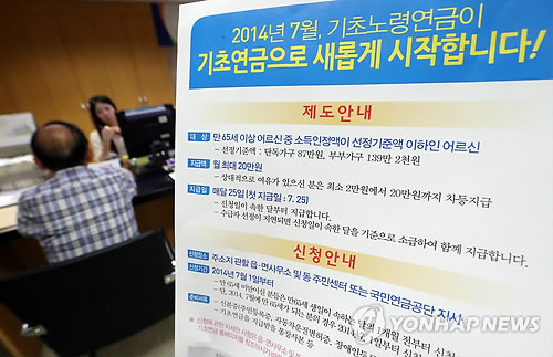 | △ (서울=연합뉴스) 작년 7월 서울 국민연금공단 종로 중구지사에서 한 어르신이 기초연금 관련 상담을 받고 있는 모습. 2014.9.18 << 연합뉴스DB >> photo@yna.co.kr |